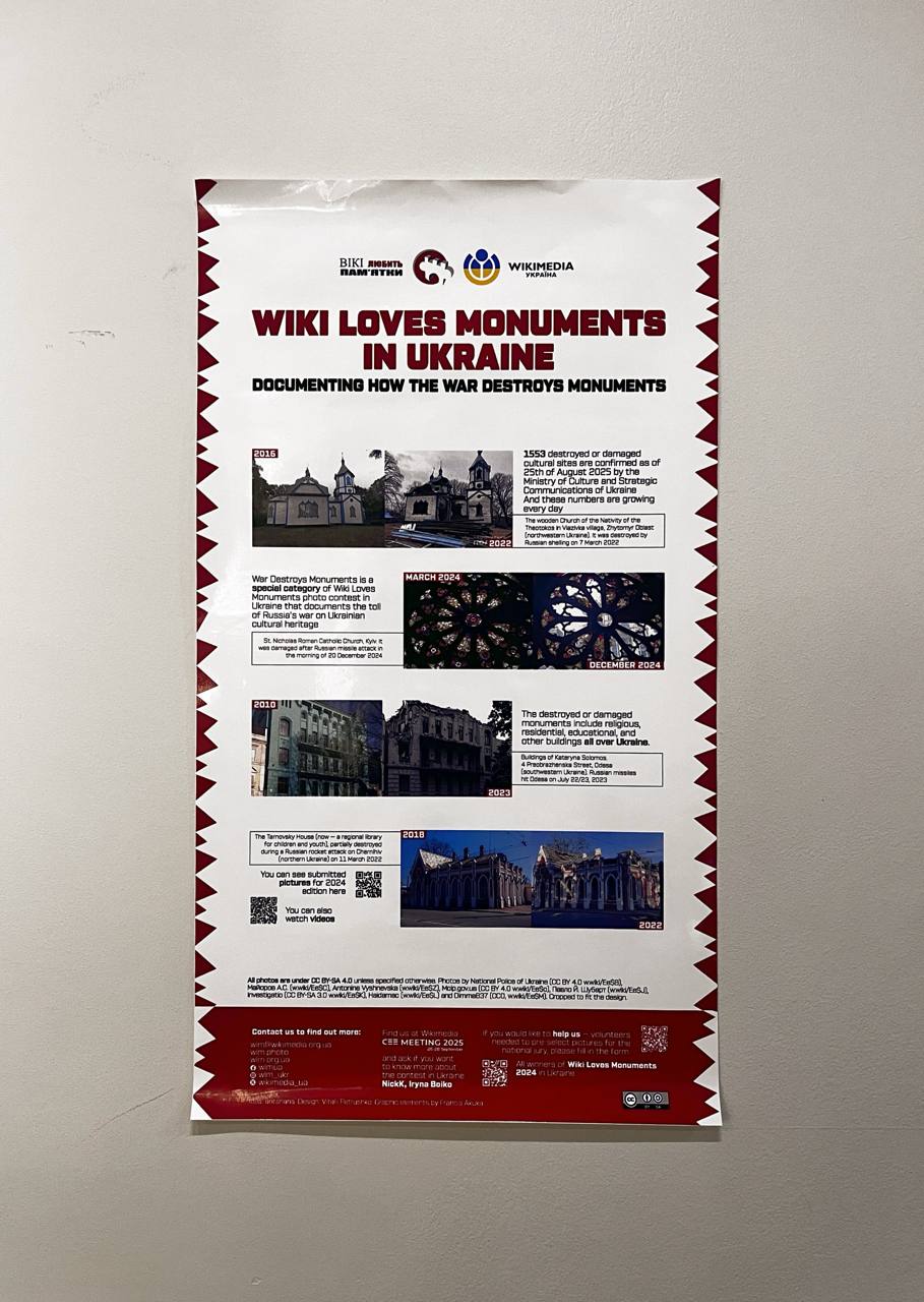 На CEE Meeting організатори також приймали постери, які опісля вивісили на одній зі стін поруч з основними залами. Попри те, що це не була класична постерна сесія, як на Вікіманії, коли окремий час у програмі виділяється саме на те, щоб учасники та учасниці могли ознайомитися з різними проєктами та досягненнями спільнот у Центрально-Східній Європі та поспілкуватися з представниками, ми все односкористалися цією можливістю та представили ще раз постер про спецномінацію «Війна руйнує пам’ятки» конкурсу «Вікі любить пам’ятки» в Україні.