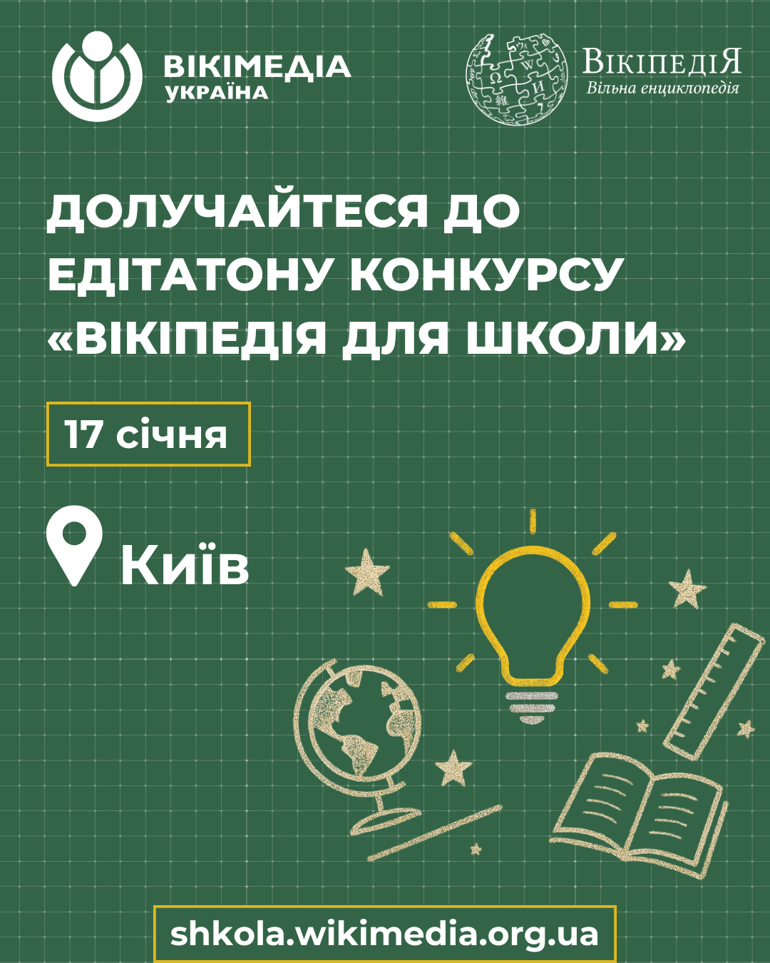 «Вікіпедія для школи» — щорічний конкурс, у межах якого ми разом створюємо та покращуємо статті, необхідні учням і ученицям для навчання. Конкурс допомагає зробити статті сучасними, зрозумілими й доступними — і саме під час едітатонів можна суттєво просунути цю роботу вперед.