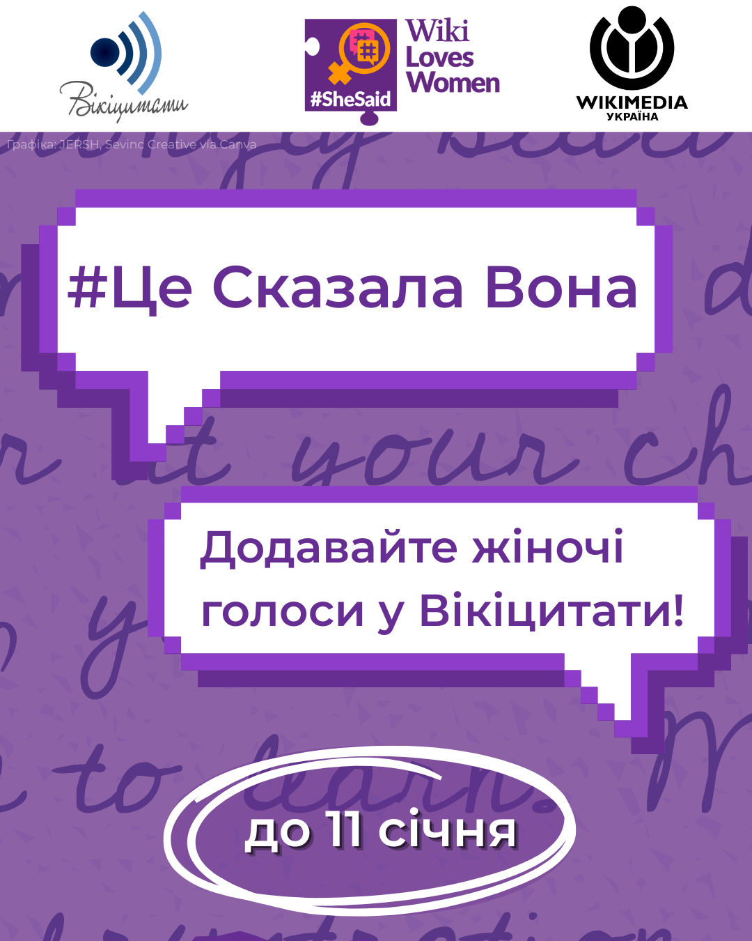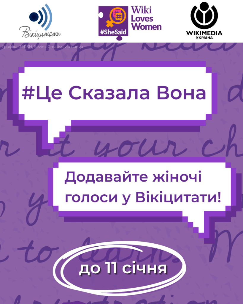 До 11 січня 2026 року триває конкурс «Це сказала вона». Участь у ньому не потребує великого досвіду: достатньо знайти надійне джерело й додати цитати видатних авторок, діячок та мислительок до статей про них.