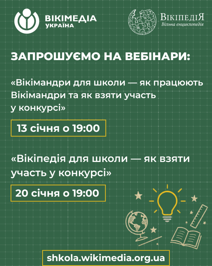 - 20 січня (вівторок) о 19:00: «Вікіпедія для школи — як взяти участь у конкурсі»