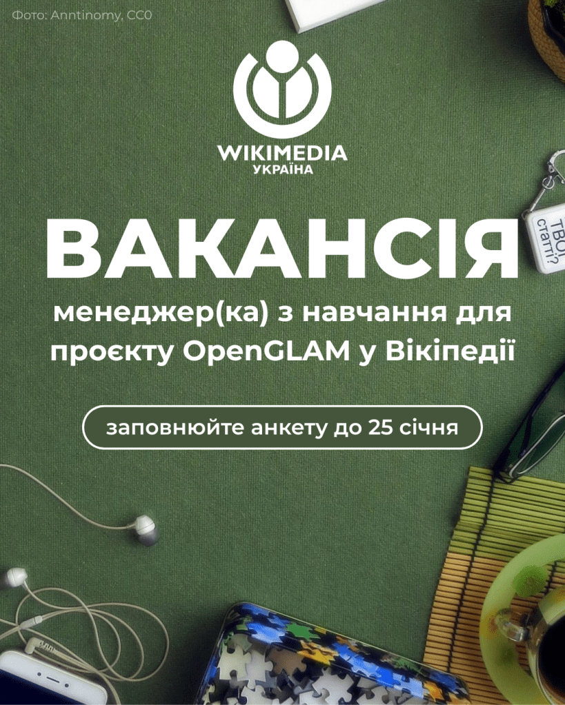 Громадська організація «Вікімедіа Україна» оголошує конкурс для пошуку менеджера(-ки) з навчання для проєкту OpenGLAM. Шукаємо людину із великим досвідом у Вікіпедії та умінням навчати інших.