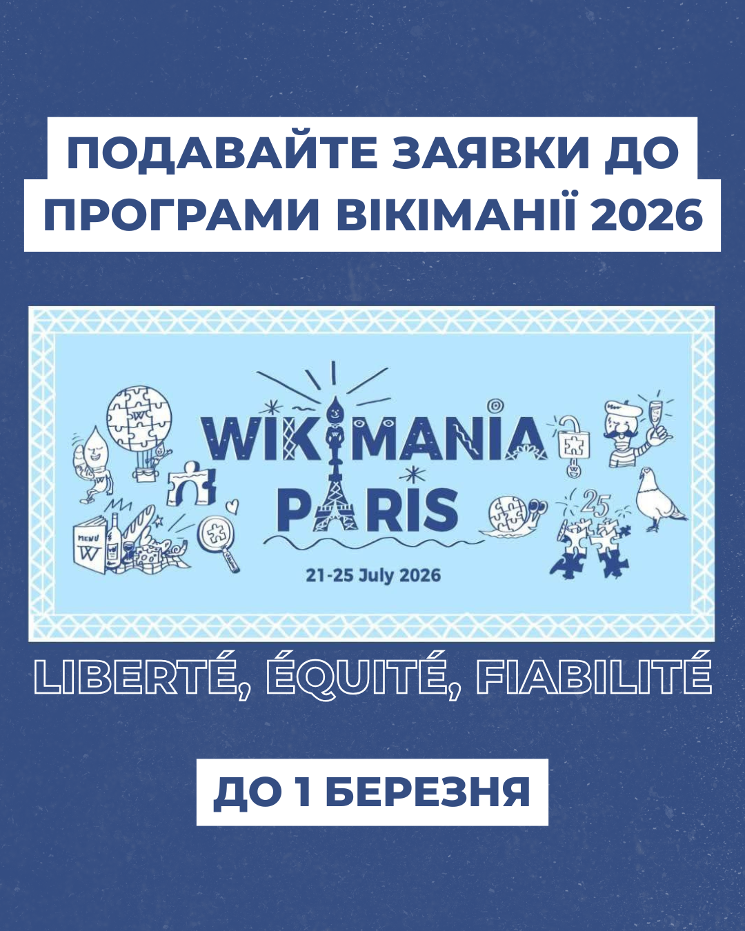 Найбільша вікімедійна конференція Вікіманія 2026 пройде у Парижі, Франція, 21—25 липня 2026 року. Поки всі чекають на результати стипендійного відбору, організатори запрошують подавати свої пропозиції до програми конференції до 1 березня.