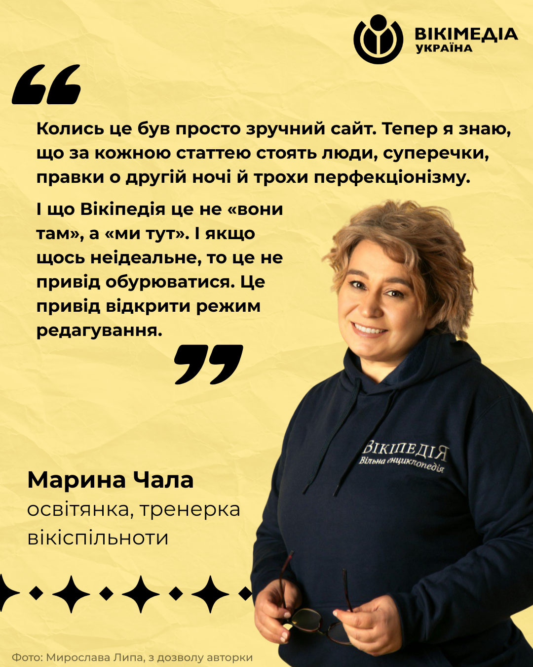 Марина Чала — досвідчена освітянка і тренерка вікіспільноти. Вона понад п’ятнадцять років наповнює Вікіпедію, має великий досвід використання вікіпроєктів на власних уроках, а також віддавна навчає інших вчителів та вчительок роботі з Вікіпедією. Наприклад, є сертифікованою тренеркою міжнародної програми «Reading Wikipedia in the Classroom» і веде програму курсів «Вікіпедія для навчання».