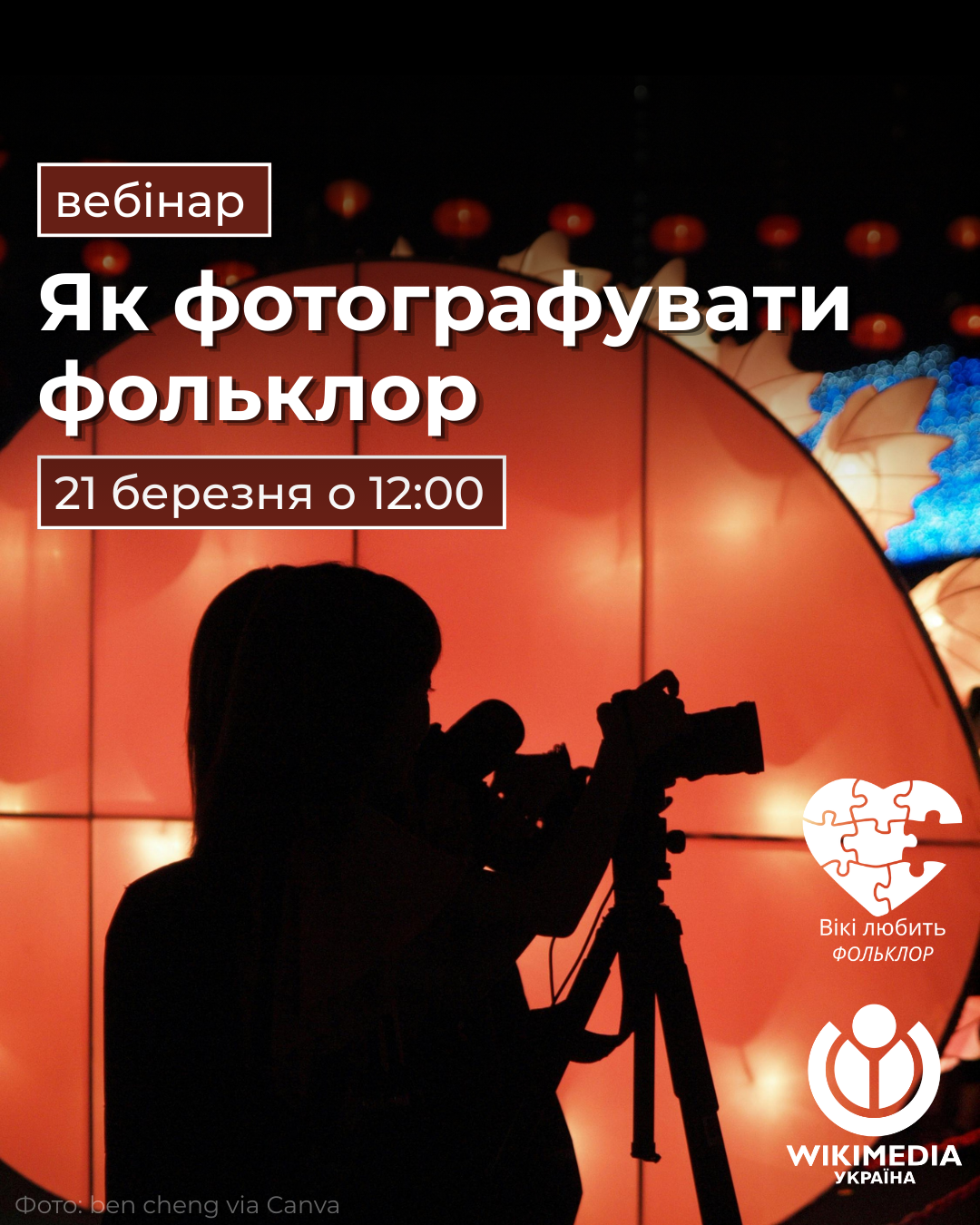 У межах фотоконкурсу «Вікі любить фольклор» запрошуємо 21 березня о 12:00 на вебінар від фотографки Мирослави Липи, де вона поділиться практичними порадами про те, як фотографувати фольклорні традиції та на що звернути увагу під час зйомки.