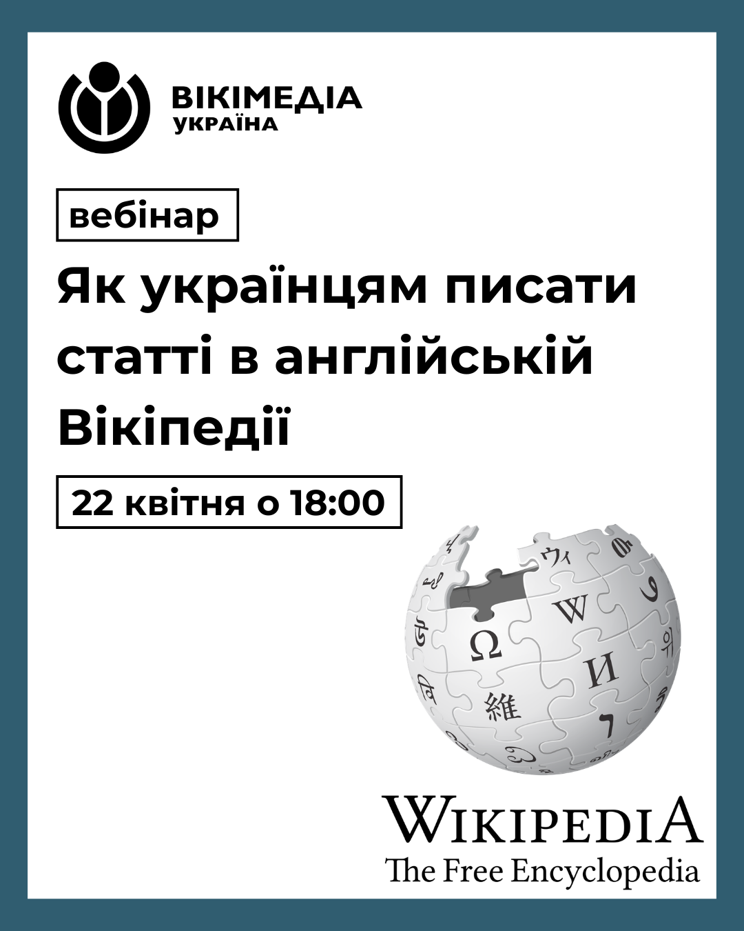 На вебінарі у середу 22 квітня о 18:00 обговоримо і розберемо основні особливості процесу створення статей в англійській Вікіпедії та чим він відрізняється від української Вікіпедії. Будемо фокусуватися на практичній демонстрації та порадах.
