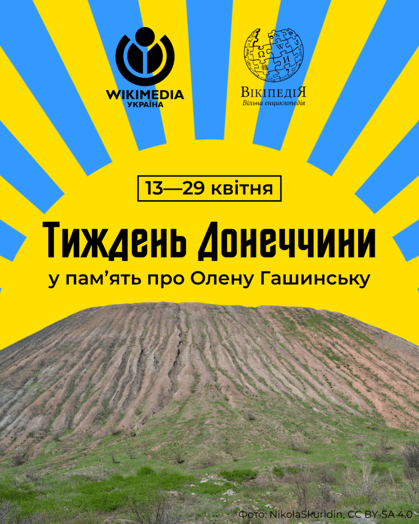 Уже 12 років Донеччина перебуває у центрі світової уваги — український регіон, який опинився у фокусі загарбницьких амбіцій Росії. Російське вторгнення з 2014 року убило десятки тисяч жителів Донеччини та змусило сотні тисяч покинути свої домівки. Серед тих, хто втратили дім — Олена Гашинська, логістка/офіс-менеджерка «Вікімедіа Україна», яка провела більшість життя на Донеччині, але була змушена покинути її у 2014 році. У березні 2026 року Олена померла, і цей тематичний тиждень ми проводимо, щоб вшанувати її пам’ять.
