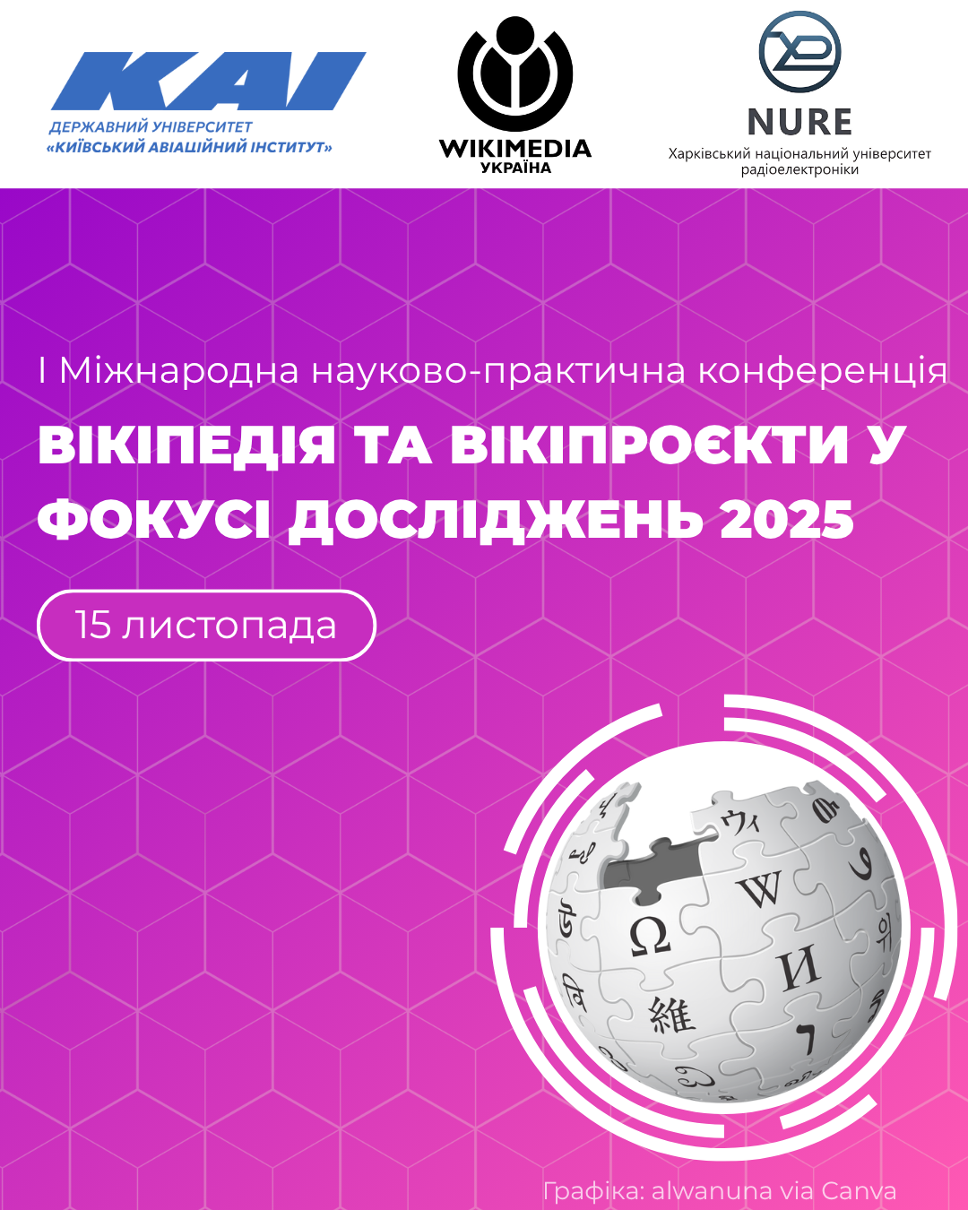 Читати даліУ цю суботу, 15 листопада, ми проведемо першу міжнародну науково-практичну конференцію «Вікіпедія та вікіпроєкти у фокусі наукових досліджень».
